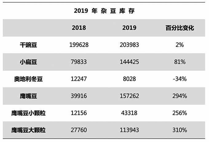 與去年相比,美國(guó)干豌豆、小扁豆及鷹嘴豆的轉(zhuǎn)入庫(kù)存要多于去年。截止2019年6月,干豌豆庫(kù)存增長(zhǎng)了2%,為20411噸;小扁豆增長(zhǎng)81%,達(dá)到144242噸。鷹嘴豆總庫(kù)存的增加了294%,達(dá)到了157396。其中,大顆粒鷹嘴豆增加了310%,為113851噸;小顆粒鷹嘴豆增加256%,為43318噸。