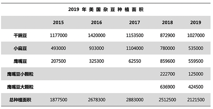 2019年鷹嘴豆種植面積將下降35%,為559500英畝。其中,小顆粒鷹嘴豆種植面積下降44%,為125000英畝;大顆粒鷹嘴豆種植面積下降32%,為434500英畝。美國(guó)鷹嘴豆種植量自國(guó)際雜豆年以來(lái),一直保持增長(zhǎng)趨勢(shì)。此次種植量的下降是在意料自外。根據(jù)NASS預(yù)測(cè),美國(guó)的科羅拉多州、密西根州、明尼蘇達(dá)州和懷俄明州沒(méi)有在2019年繼續(xù)種植鷹嘴豆。